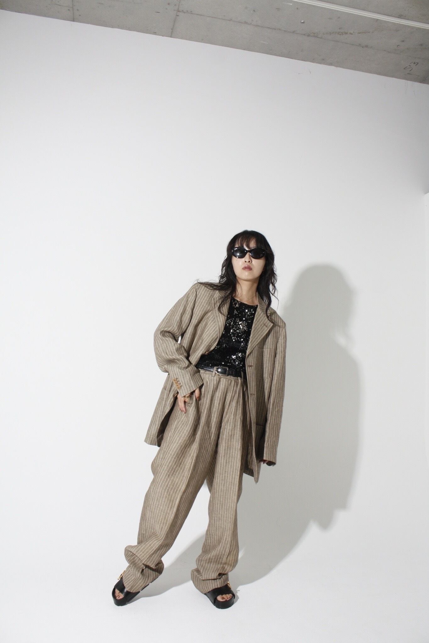 リネン素材のストライプスラックスパンツ。メンズサイズ。抜け感のあるシックなデザイン。