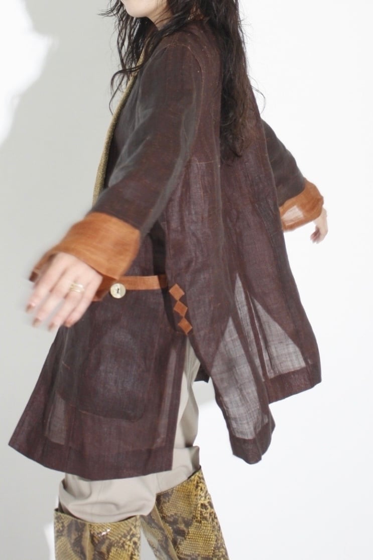 リネン素材の表面にコーティングをされており、光沢があり、パリっとした張り感のある素材。